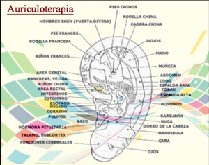 La acupuntura auricular consiste en insertar agujas de acupuntura en el lóbulo de la oreja, ya que según la Medicina Tradicional China la oreja es una zona refleja del cuerpo humano, correspondiendo cada zona del lóbulo a ésta es una zona refleja del resto del cuerpo y por tanto, existen puntos maestros de la Medicina Tradicional China que abordan con este procedimiento, un amplio abanico de trastornos y enfermedades)